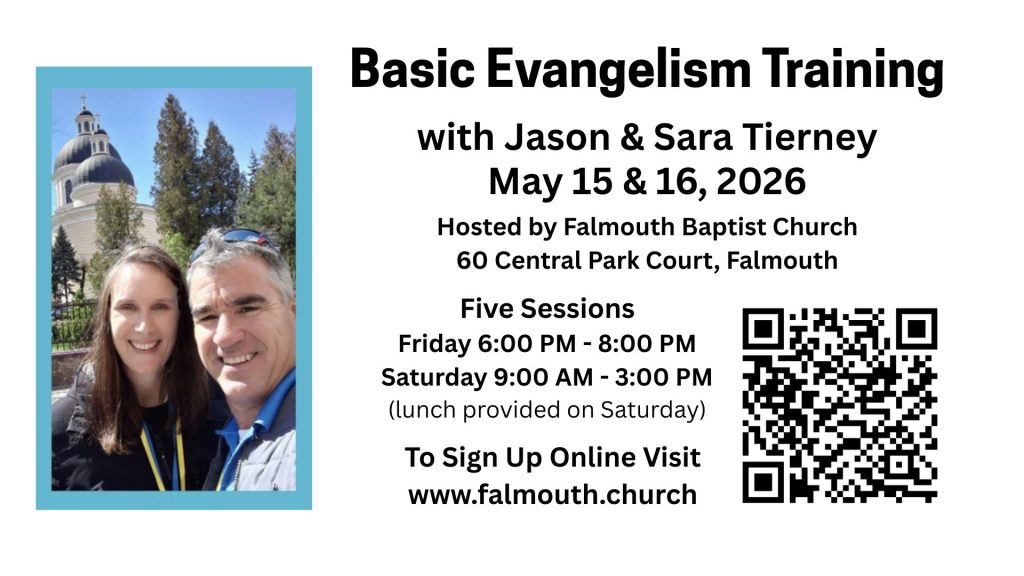 60 Central Park Court Falmouth, MA 02540 Falmouth Baptist Church Directions Basic Evangelism Training Date May 15 – 16, 2026 Time 6:00 pm Category Community, Men, Services & Events, Women Registration Form Please enable JavaScript in your browser to complete this form.Full Name *Phone Number *Email *Name of Home ChurchAddressAddress Line 1Address Line 2City— Select state —AlabamaAlaskaArizonaArkansasCaliforniaColoradoConnecticutDelawareDistrict of ColumbiaFloridaGeorgiaHawaiiIdahoIllinoisIndianaIowaKansasKentuckyLouisianaMaineMarylandMassachusettsMichiganMinnesotaMississippiMissouriMontanaNebraskaNevadaNew HampshireNew JerseyNew MexicoNew YorkNorth CarolinaNorth DakotaOhioOklahomaOregonPennsylvaniaRhode IslandSouth CarolinaSouth DakotaTennesseeTexasUtahVermontVirginiaWashingtonWest VirginiaWisconsinWyomingStateZip CodeNotes:Submit