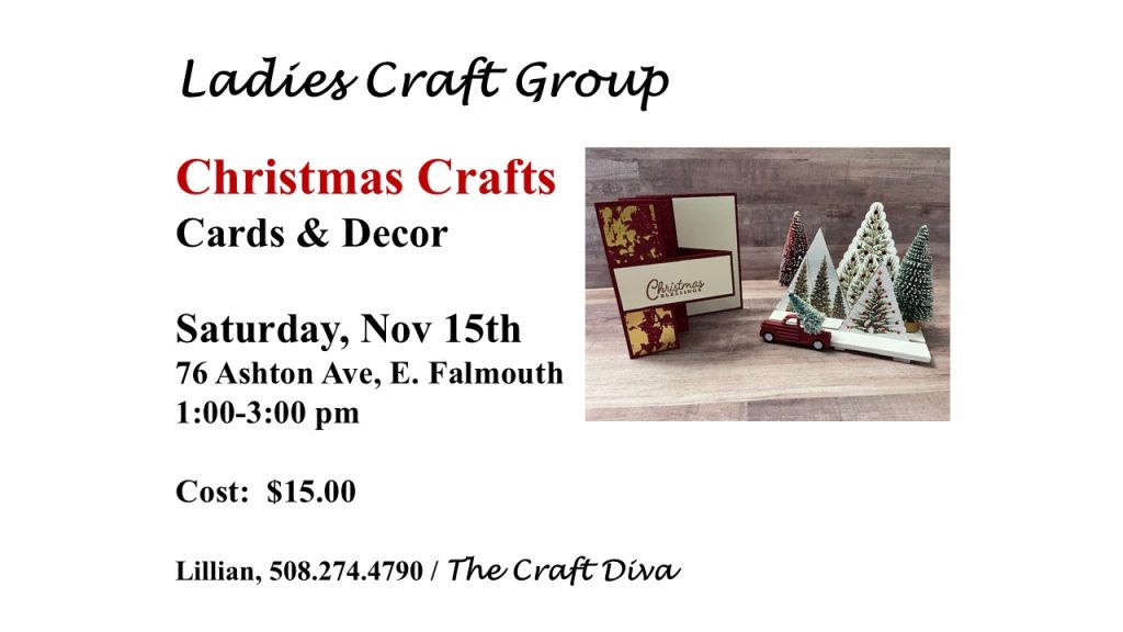 Join the Craft Diva & friends from 1:00 – 3:00 for a fun time of fellowship and creativity! This month’s project will be Christmas cards & decor.