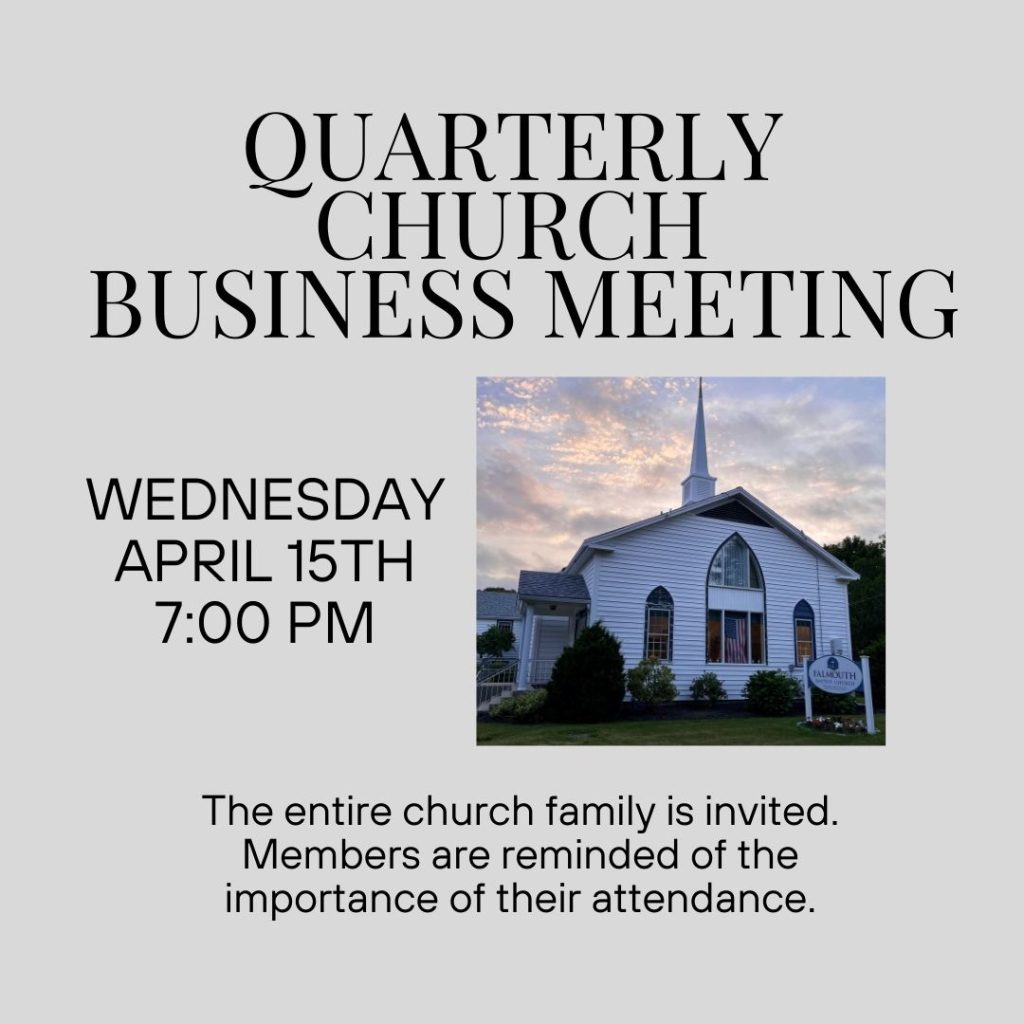 60 Central Park Court Falmouth, MA 02540 Falmouth Baptist Church Directions Quarterly Business Meeting Date April 15, 2026 Time 7:00 pm Category Services & Events Please Join us April 15, 2026 at 7 PM as we celebrate what God is doing in our church. Members are reminded of their responsibility to attend. Church family invited.