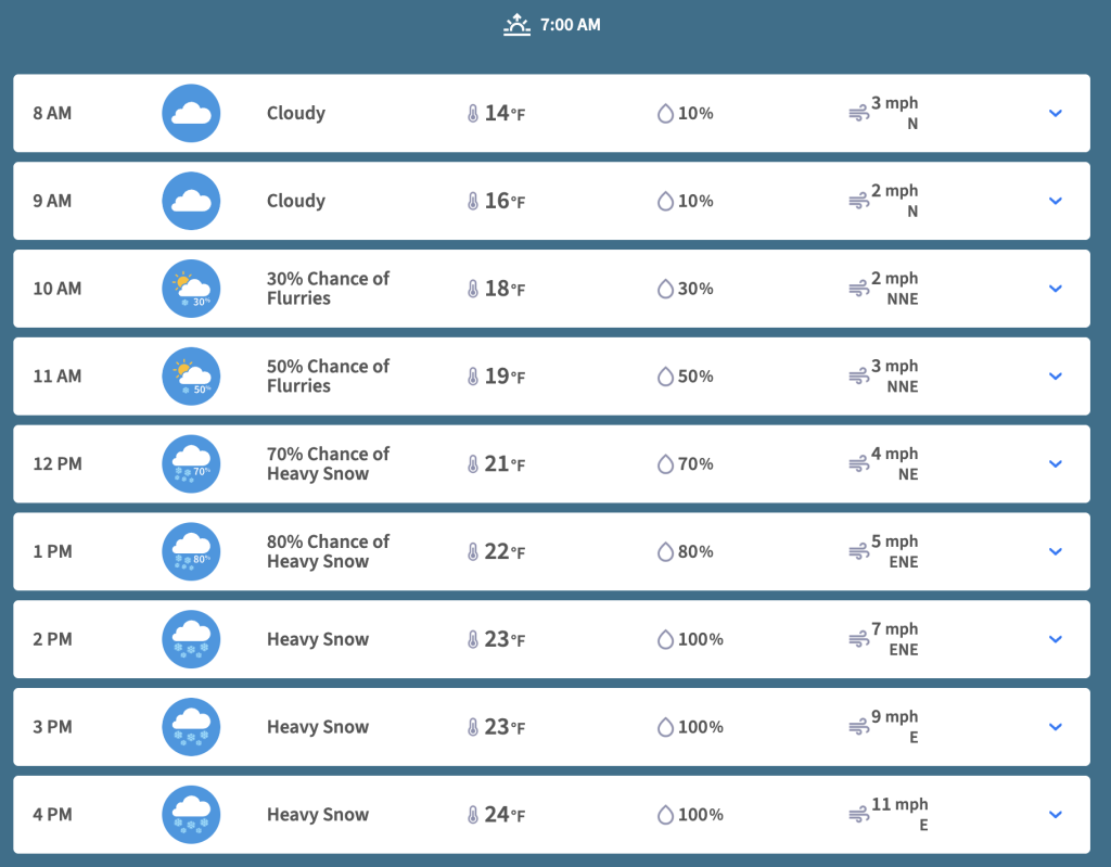 Second, the forecast shows that the probability of snow is not significant in Falmouth until after 11AM.